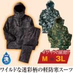 ●送料:648円(通常) ワイルドな迷彩柄の軽防寒スーツ。 ■表地・裏地・中わた:ポリエステル100% ◆トップス:胸ファスナーポケット付、フード周りドローコード付、裾ドローコード付、ボトム:ウエスト総ゴム、右後ポケット付 ◆中国製 [32079]
